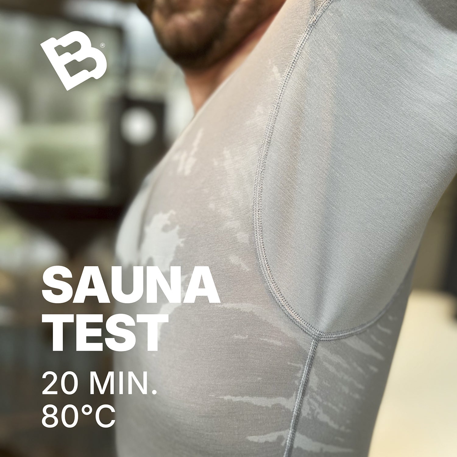 Vi kunde inte låta bli, så vi skickade in Henrik i bastun – iförd anti-sweat t-shirt och skjorta. För ja, det är ju vår plikt att testa t-shirten på alla tänkbara sätt.